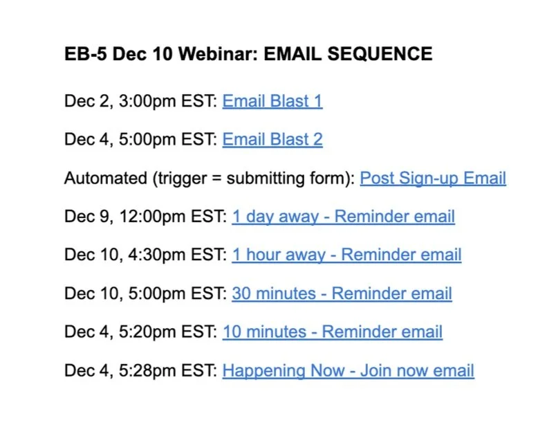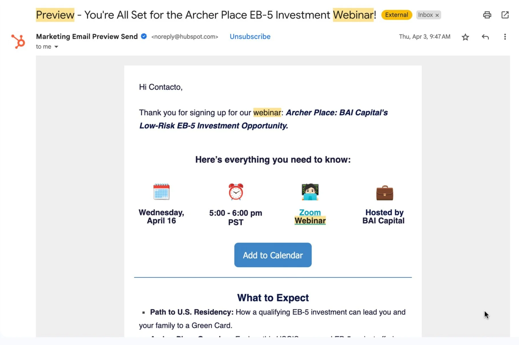 By segmenting the email list based on previous interactions and engagement, I crafted a tailored sequence of emails that highlighted the benefits of the EB-5 program, the highlights of this project, and the value of attending the webinar series. Used persuasive copy to guide recipients through the various stages of the decision-making process, from initial interest to final registration.
