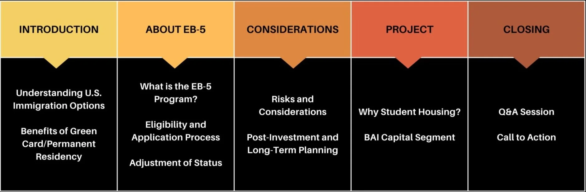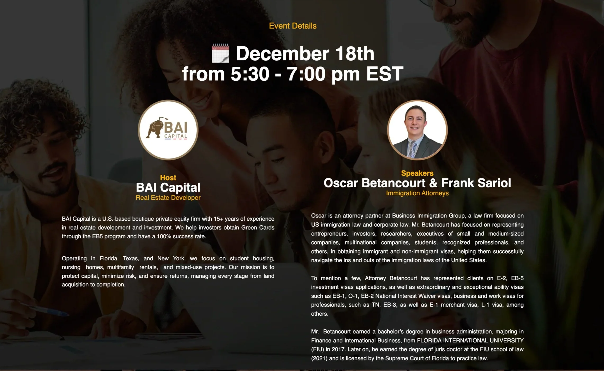 Developed the presentation materials, focusing on presenting BAI Capital’s project, Archer Place, as a high-value, low-risk EB-5 investment opportunity. As the host, I facilitated each session, moderating discussions, responding to live questions, and guiding the conversation to ensure a smooth, engaging experience for attendees.