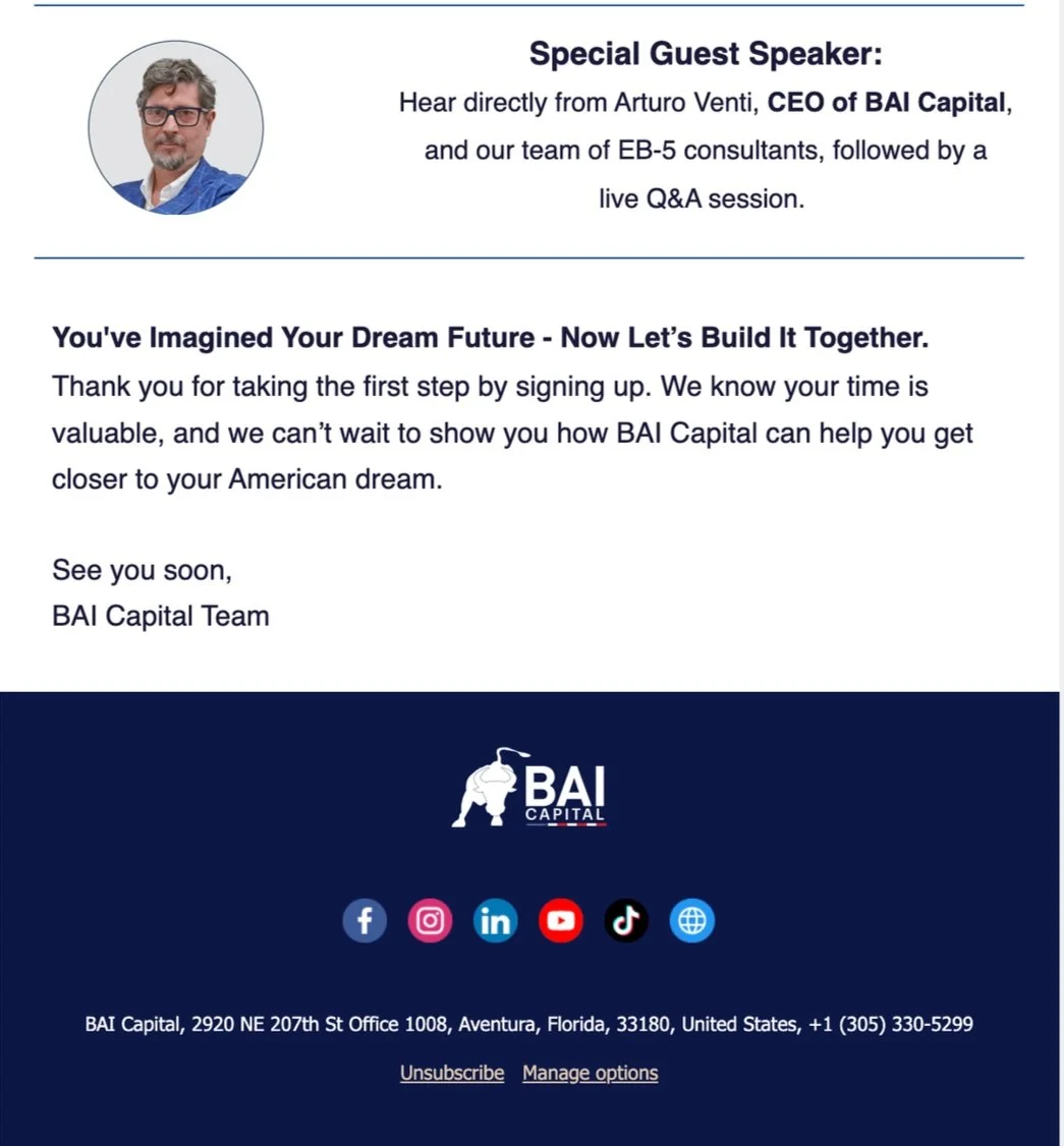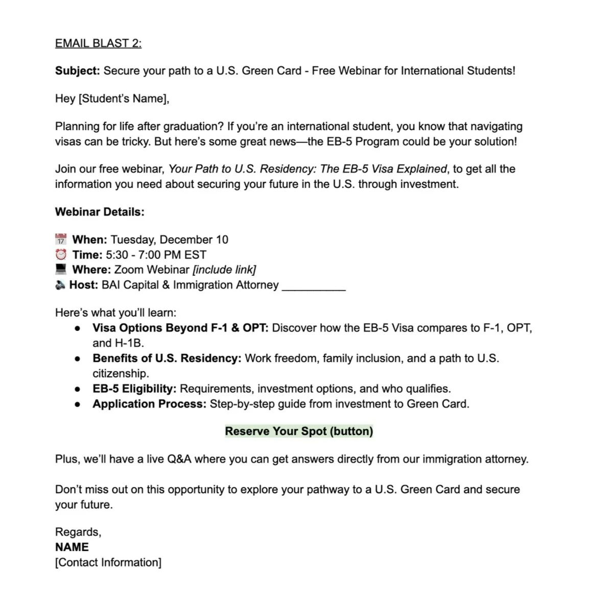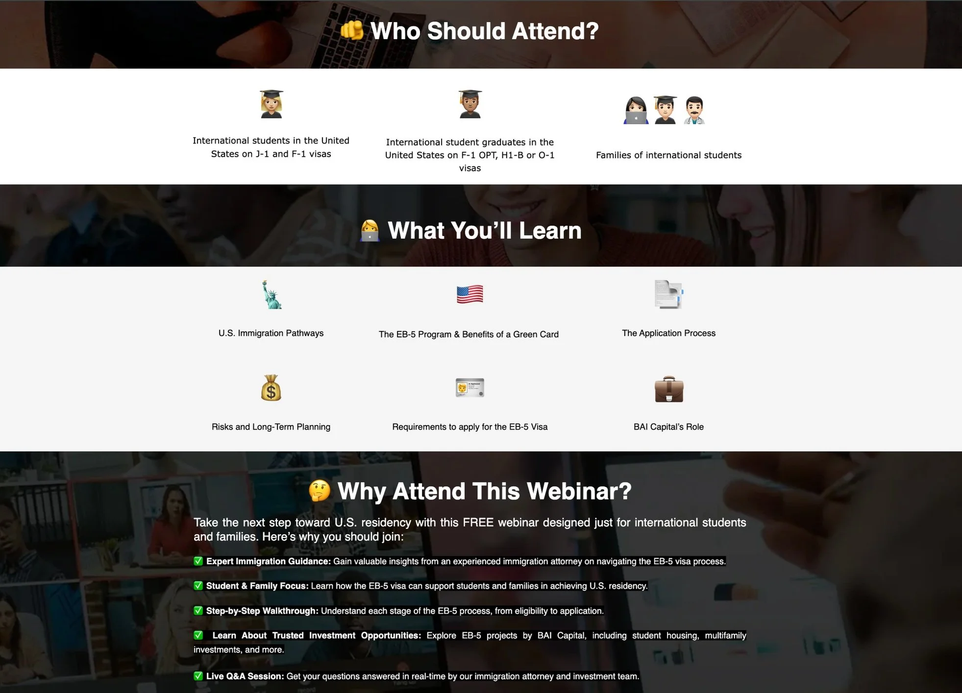 In parallel with the email and paid campaigns, I contributed to the creation of a dedicated landing page for the webinar series. I collaborated closely with the web development team to ensure the page was optimized for conversion, writing clear, persuasive copy that emphasized the unique benefits of attending the webinar, such as gaining direct access to the CEO to ask any investment-related questions and learning how to navigate the EB-5 application process.