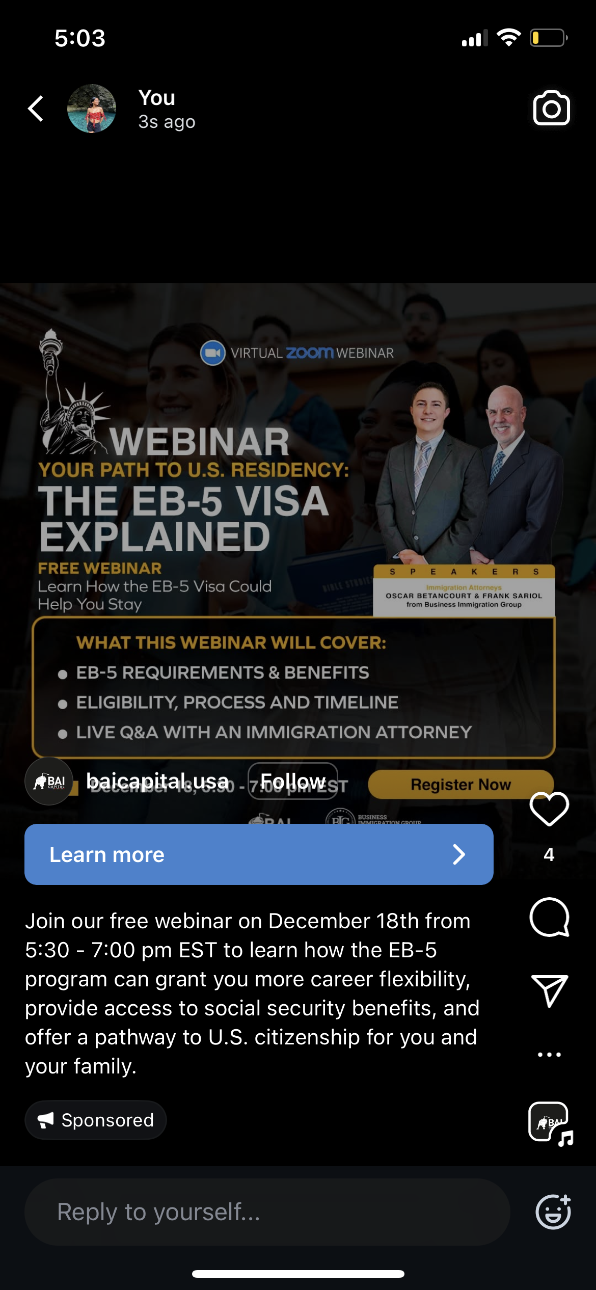 Wrote compelling, concise ad copy that spoke directly to the pain points of our target audience, highlighting the opportunity to secure U.S. residency through an investment. I also ran multiple A/B tests on different ad versions to refine messaging and increase ad performance.