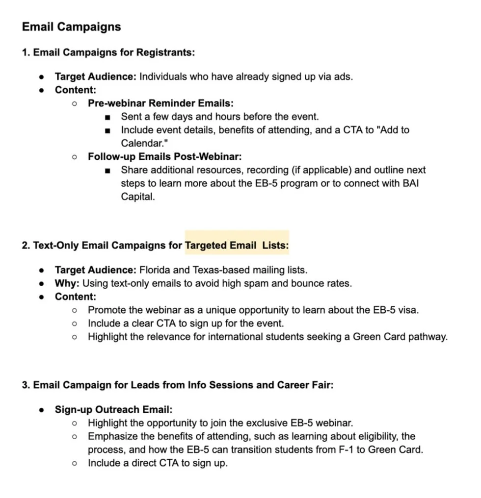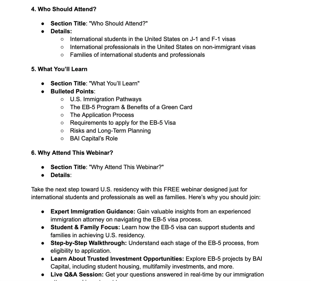 Led the development and execution of the overall webinar strategy, from identifying the target audience to defining the content structure. Collaborating with the internal investment team, I ensured the topics covered were both relevant and informative, offering clarity on the investment process, legal requirements, and the benefits of the EB-5 program.